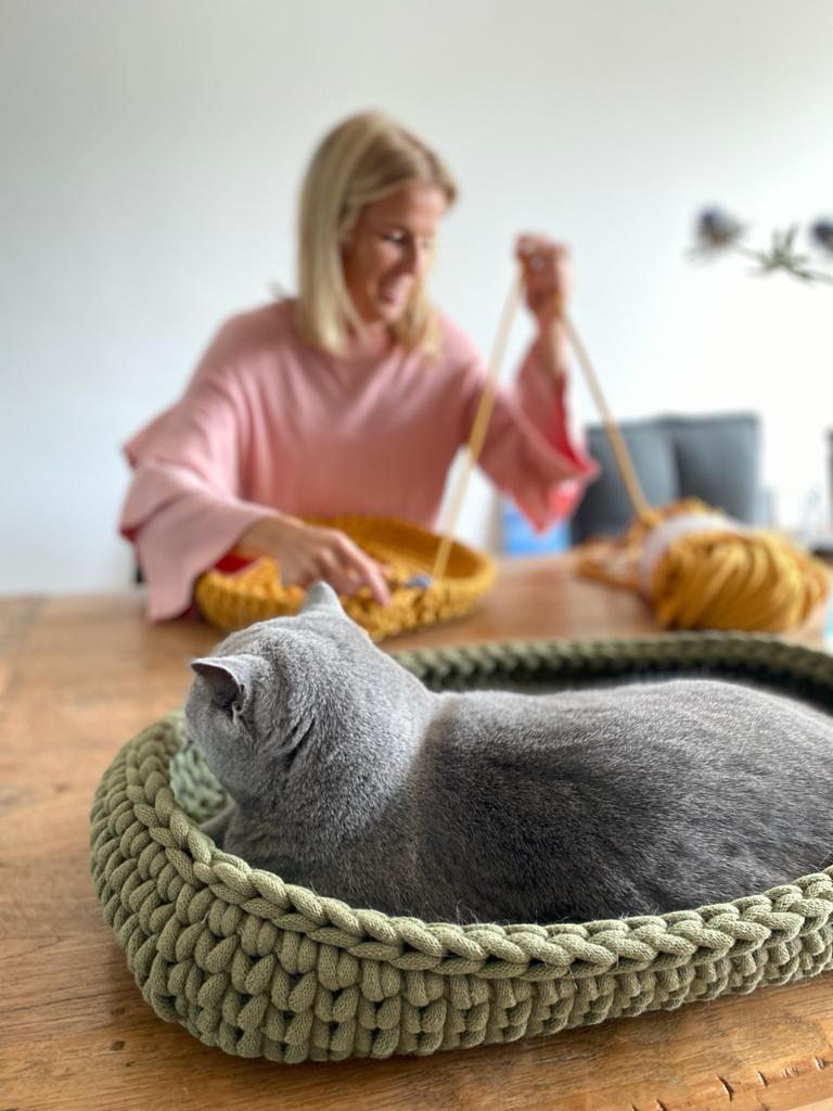 Mijn naam is Daniëlle en Sunny is de naam van mijn lieve Britse korthaar. Voordat Sunny in 2018 bij ons kwam wonen, begon de zoektocht naar een mooi en fijn mandje. Dit bleek lastiger dan gedacht. Te fluffy, synthetisch, gekke kleuren.. Ik werd er niet vrolijk van en besloot zelf aan de slag te gaan met mooi duurzaam materiaal en niet geheel onbelangrijk met kleuren die aansloten op mijn interieur. Er ontstond een grofgehaakte stoere mand die ook bij bekenden in de smaak viel. Voordat ik het wist was Sunny Baskets geboren en volgden er vele haaksessies aan de eettafel. Uiteraard onder toezicht van Sunny....